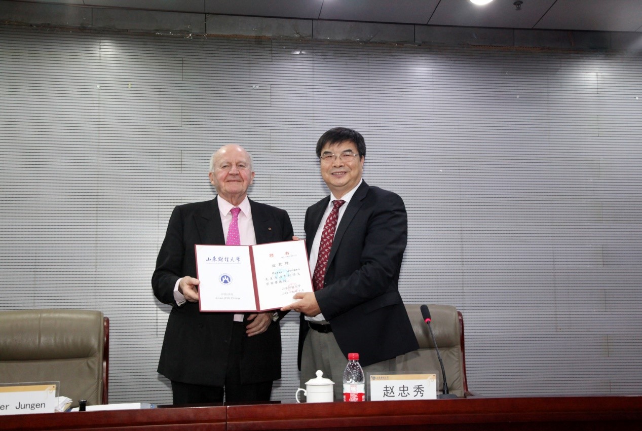11月8日,应山东财经大学校长赵忠秀教授的邀请,德国天使投资联盟创始人兼总裁彼得•荣根(Peter Jungen)教授为我校师生作题为Development of China in the Last 50 Years的讲座,校长赵忠秀为彼得•荣根先生颁发荣誉教授证书并致辞。