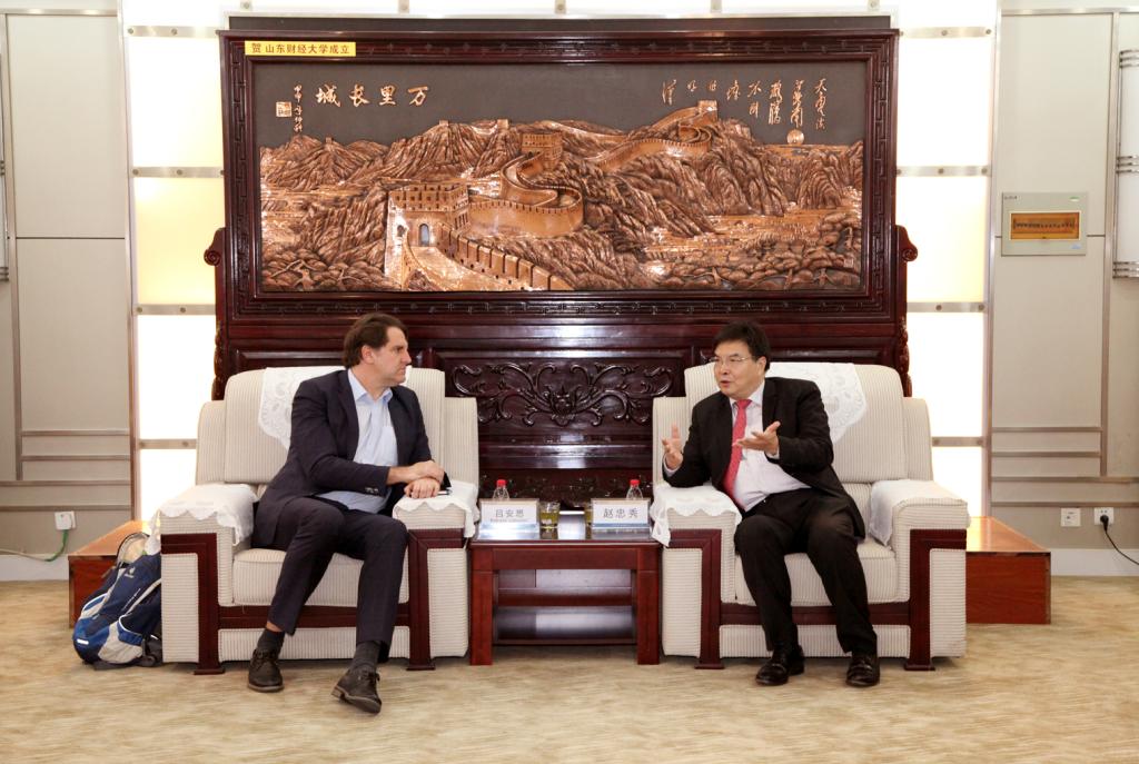 3月1日上午,校长赵忠秀会见了吕安迪(Andreas Loeschel)院士,教务处处长陶虎、国际交流与合作处处长王剑波、外国语学院院长李毅等陪同参加。赵忠秀校长对吕安迪院士一行来访表示热烈欢迎,并介绍了我校校情、未来发展方向及山东省能源产业升级等情况 。吕安迪院士重点介绍了德国能源转型与新经济发展的关系。赵忠秀校长表示,新兴产业的发展为高校社会急需专业建设带来新的发展机遇,未来我校将进一步加强产教融合,提高服务山东经济社会发展能力,并探讨了联合建立山东财经大学低碳经济研究院的可行性与必要性。双方还就促进学生交流、深化国际交流、推动山东省与德国的交流合作等方面达成共识。