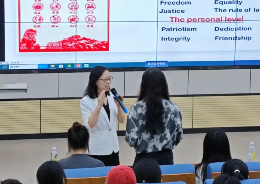 山东财经大学国际语言服务现代产业学院执行院长、院长助理张斐瑞副教授主讲了《综合商务英语》。课程以商务场景为背景,强化学生的英语听、说、读、写能力。课堂以“leadership”单元为例,从马斯克的领导风格开始,引入领导力风格的具体内容,通过背诵、视译、理解、反思等教学方法和环节,多角度培育学生的语言能力,帮助学生在不同情境下应用所学知识。