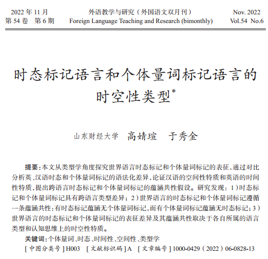 我院于秀金教授(通讯作者)和研究生高婧瑄同学合作的学术论文《时态标记语言和个体量词标记语言的时空性类型》在《外语教学与研究》2022年第6期发表。该刊在CSSCI“语言学(外国语文)”类期刊中居首位,系我校A1类期刊。