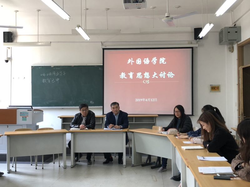 4月12日下午,外国语学院召开教育思想大讨论师生座谈会,贯彻落实全国高等学校本科教育工作会议精神,学院党委书记甘建青、院长李毅、院党委副书记陈海、院专职组织员齐文茜和全院各班代表参加了此次座谈会。
