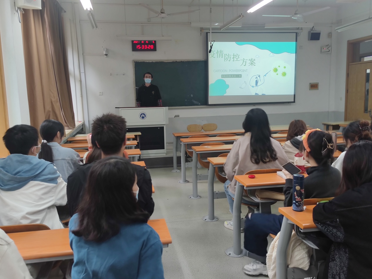 外国语学院于2021年10月20日面向外国语学院主要学生干部召开新型冠状病毒防治知识宣讲,由孙自忠老师主持会议,向全体学生普及新型冠状病毒的防治知识,并要求全体师生在日常生活中做好新型冠状病毒的防治工作。