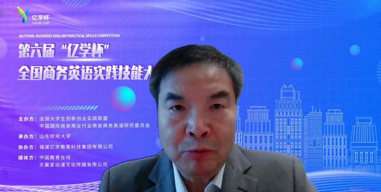 中国国际商会商业行业商会商务英语研究委员会副理事长、山东财经大学区域与国别研究院执行院长李毅作闭幕式致辞,表示“亿学杯”大赛不仅是对大学生语言综合运用能力的检测,更是为全国商务英语专业学生搭建了一个充分将自己所学知识运用于实践的平台。