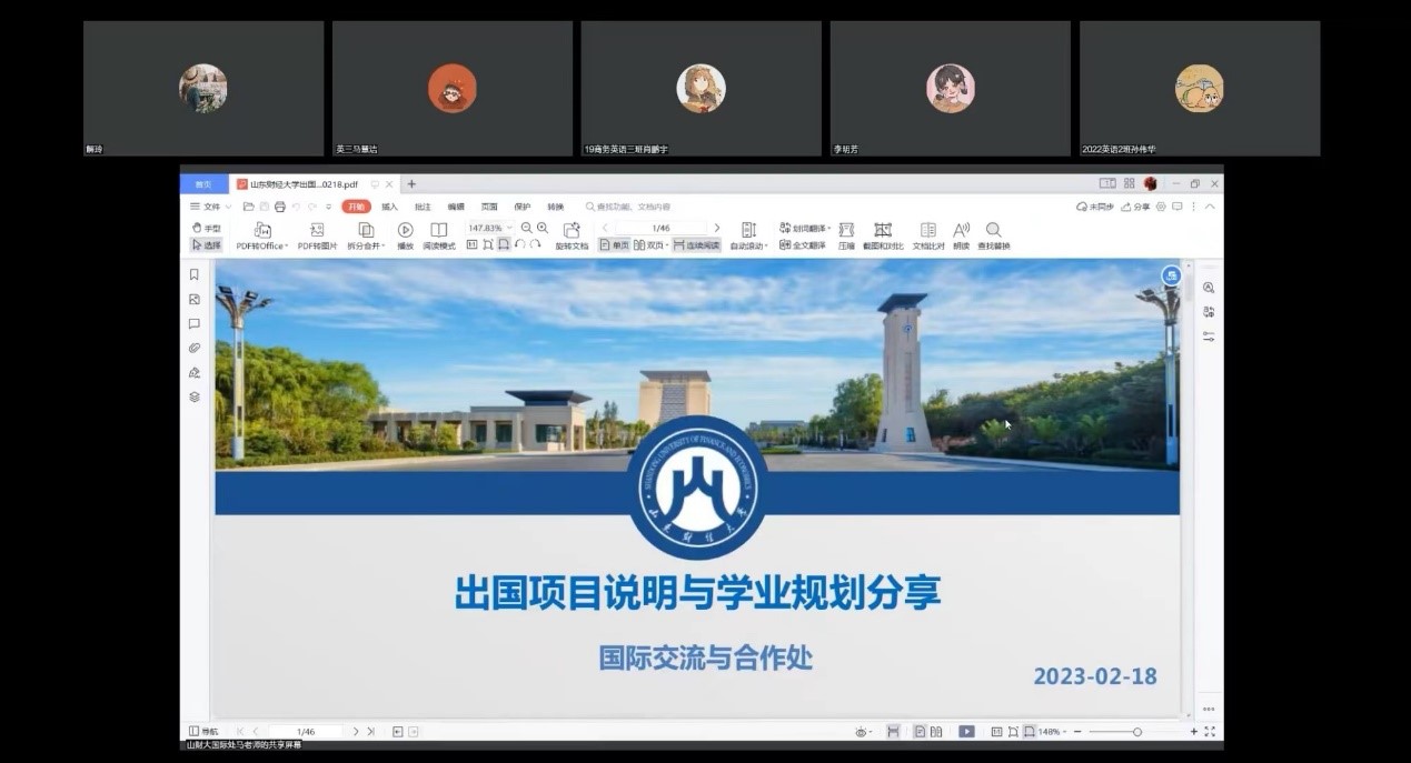 2023年2月18日上午,为拓宽升学途径,外国语学院特开展线上出国项目说明与学业规划分享会。会议由我院副院长解玲主持,邀请了国际交流与合作处的领导和老师对相关项目进行讲解,我院部分本科生及研究生参加会议。