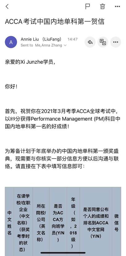 我是来自2019级英语四班的袭俊哲,现任院学生会秘书处副部长及班内学习委员。取得校优秀学生干部,校级优秀共青团员等荣誉称号。ACCA(The Association of Chartered Certified Accountants)在学,目前通过5门ACCA考试,均一次性通过。在3月考季中,以89分通过PM(Performance Management),取得中国内地单科第一的成绩。