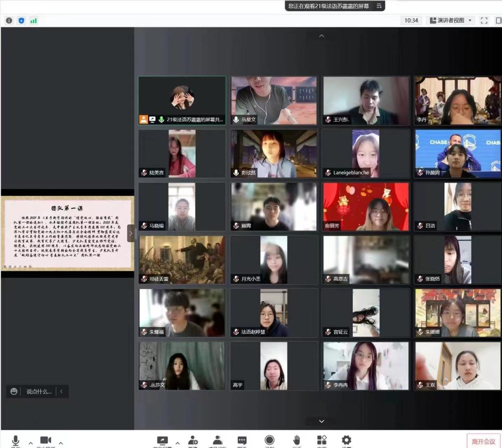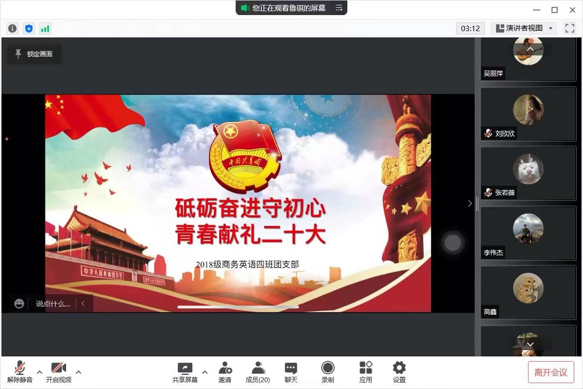 百年大计,教育为本。习近平总书记强调,“为谁培养人、培养什么人、怎样培养人”始终是教育的根本问题。疫情当下,网课已成为最安全高效的上课形式。但即使是在网课期间,同学们也能保持昂扬向上的精神风貌,确保以高质量的精神状态进入课堂,积极讨论并回答课堂问题,实现高效率高水准网课。