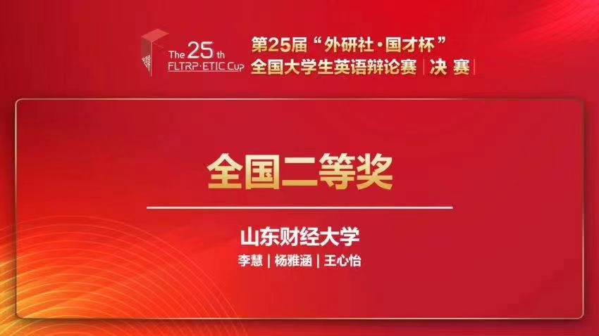 于烽火中道古今,于微言中道大义。6月10-11日,第25届“外研社·国才杯”全国大学生英语辩论赛拉开帷幕。我院2020级英语二班杨雅涵、王心怡组成的代表队在此次竞赛中,经过八轮循环赛的角逐,最终荣获全国二等奖,指导老师李慧获得优秀指导教师奖。