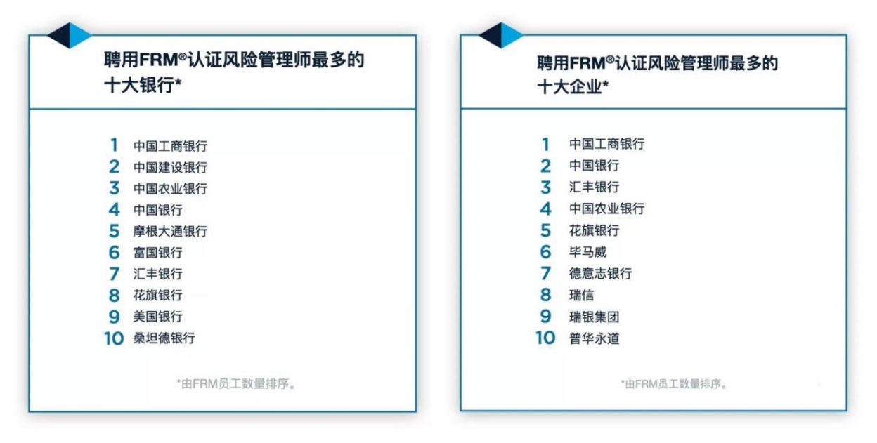 全球风险管理者和各大企业雇主将FRM 头衔作为衡量金融风险管理人员专业水平和诚信度的标准。美国、加拿大、英国等国家的许多著名风险管理机构,已把获得 FRM 资格列为对其高级雇员的考核要求。