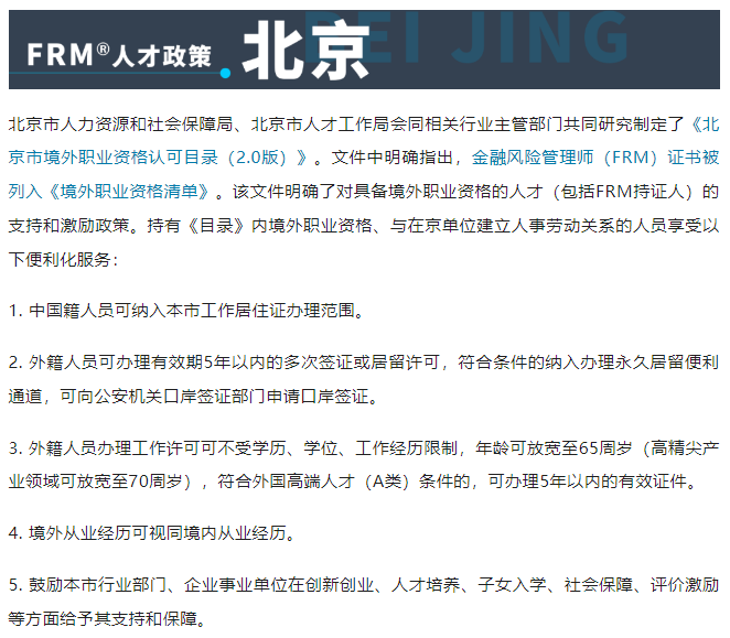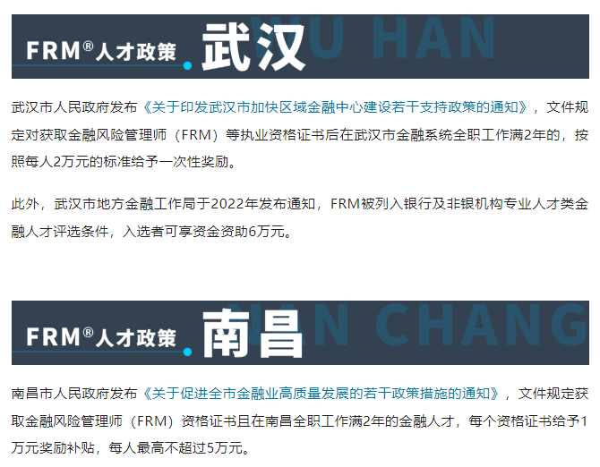 为吸引和鼓励金融高端人才与紧缺人才,许多省市出台了针对FRM持证人的政策福利,包括北京、上海、广州、深圳、南京、青岛、成都、西安、天津、杭州、宁波、厦门、武汉、南昌等。这些政策福利包括证书补贴、入户便利、培训支持,税收优惠等。