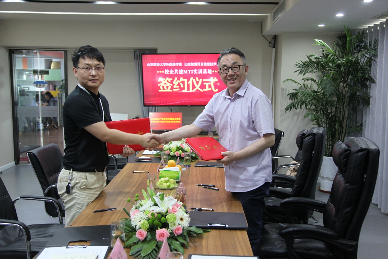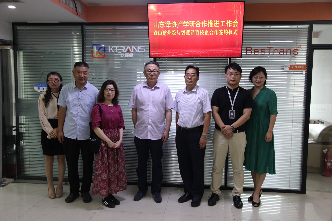 2020年7月17日下午,山东财经大学外国语学院与BesTrans智慧译百共建翻译硕士实训基地签约揭牌仪式在山东智慧译百信息技术有限公司举行。山东省外事翻译中心主任、山东省翻译协会会长刘源顺,山东省翻译协会秘书长姜迪;外国语学院院长李毅、副院长史汝波、翻译硕士教育中心主任解玲;智慧译百创始人江心波、翻译事业部总经理葛玉梅、副总经理杨玉猛先生等共同出席签约仪式。