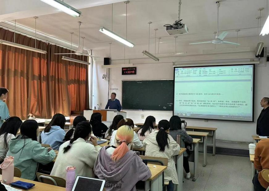 陆丙甫教授主要从功能主义的视角阐释了三个命题:形态句法在汉语言研究中的局限性、非形态句法(语序)相较于狭义形态句法的解释力以及可别度原则与语义靠近原则的互动关系等。陆教授提到,形态句法更适用于形态丰富的印欧语言,形态是表面的不稳定现象,“形态形态,千奇百怪”,而语序则是人类语言共性的凝结,体现了语言遵循人类的一般认知规律,可别度原则与语义靠近原则二者的互动关系影响了语言对于语序的选择,语序也反映了语言对于二者的取舍。陆教授在报告中还举了许多语言实际案例以帮助师生理解。最后,我院师生还与陆教授就相关学术问题进行了互动答疑。