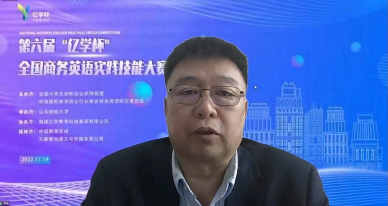 中国国际商会商业行业商会商务英语研究委员会副理事长、山东财经大学区域与国别研究院执行院长李毅作闭幕式致辞,表示“亿学杯”大赛不仅是对大学生语言综合运用能力的检测,更是为全国商务英语专业学生搭建了一个充分将自己所学知识运用于实践的平台。