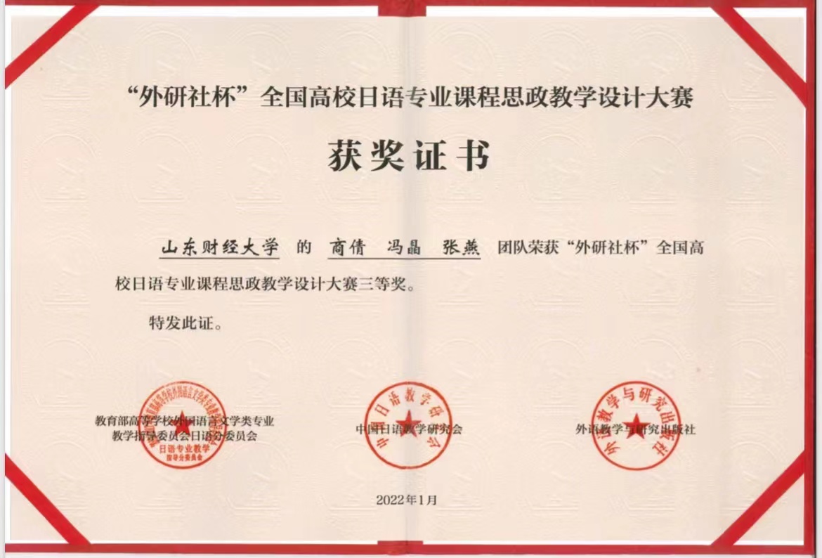 近日,首届“外研社杯”全国高校日语专业课程思政教学设计大赛结果公布,本次大赛共有来自全国高校的106支参赛队伍参加。经过专家评审与网络投票的激烈角逐,我院日语系商倩博士主讲的参赛作品脱颖而出,斩获三等奖。