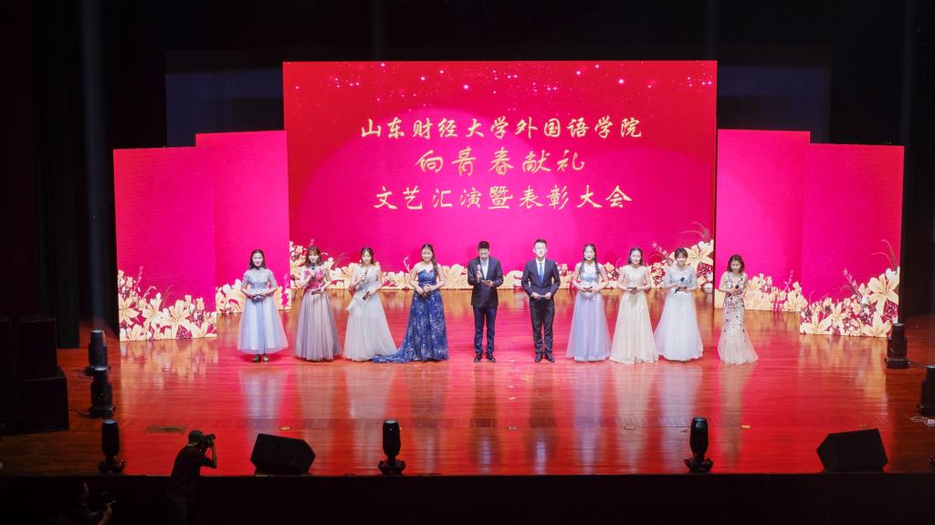 不负韶华,追梦逐光。向青春献礼,我们朝气昂扬。2019年5月9日晚7点,外国语学院“向青春献礼”文艺汇演暨表彰大会于舜耕校区礼堂举行。校党委副书记赵友春出席晚会并致辞,校研究生院院长毕秀玲,校党委学生工作部副部长董瑞华,校教务处副处长孙德昌,校科研处副处长王晓迪以及外国语学院班子成员陪同参加活动。