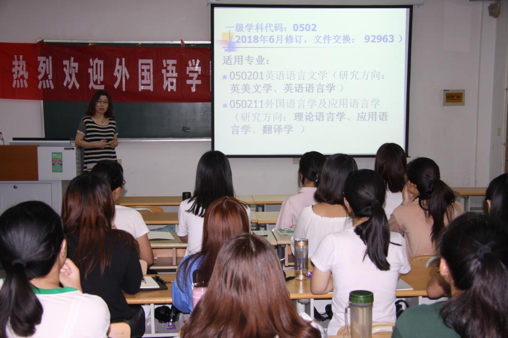 史汝波副院长就研究 生新的培养方案、培养目标及课程设置详细的向同学们做了介绍,就学术型硕士和专业型硕士不同的培养方案、课程设置及论文写作要求分别做了相关阐述,使同学们对未来的学习生活有了更好的了解。同时,鼓励大家能利用好学校的知网和语料库等来搜集阅览相关文献,注重学术论文的写作。同时希望新生及时调整心态和学习方法来适应丰富忙碌的研究生生活。最后,老师们表达了对同学们的祝贺,并希望同学能够好好珍惜宝贵的研究生生活,徜徉在学术的海洋中,进一步提高自我的学术水平,勤奋努力,砥砺前行,为进一步走向社会打下坚实的基础。