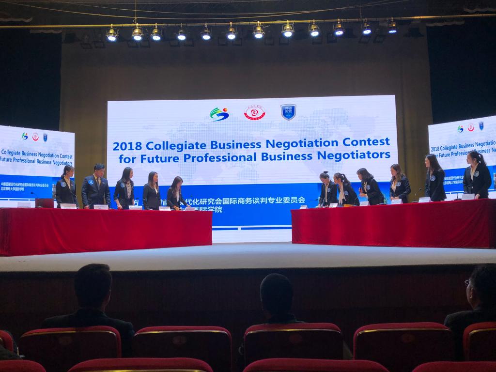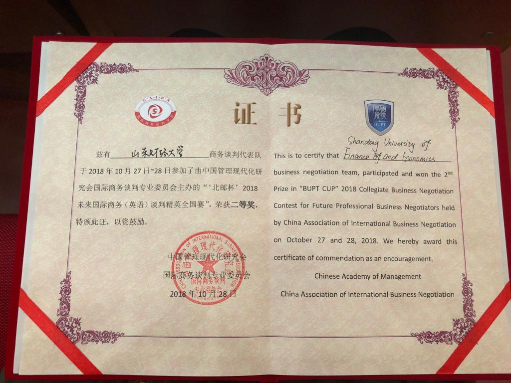 10月27-28日,由中国管理现代研究会国际商务谈判专业委员会主办、北京邮电大学国际学院承办的“北邮杯”2018未来国际商务英语谈判精英赛在北京邮电大学举行,来自全国高校的16支代表队参加了决赛。由我院张斐瑞老师担任领队,王钰莹、陆雯昕、王菲玲、曲春雨、陈雨婷、冷馥宇六位同学组成的山东财经大学代表队在首发出场的比赛中表现抢眼,最终获得团体二等奖的优异成绩,王菲玲同学获得“最佳谈判手”的荣誉称号。