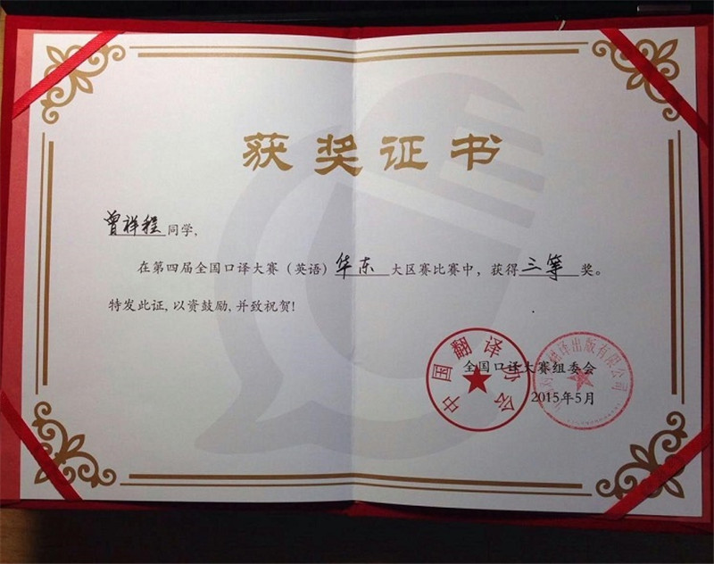 5月17日,由中国翻译协会语言服务能力与评估中心主办、南京师范大学承办的第四届全国口译大赛华东大区赛在南京举行。来自华东六省一市的近百名优秀学子为进入全国总决赛展开激烈角逐。我院2014级翻译硕士曾祥程同学在指导教师张明彬的带领下参赛,荣获三等奖。
