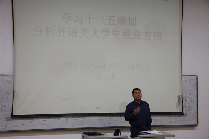 (通讯员:朱维霞)五一过后,初夏的气息愈加浓烈,08级学生的大三下学期也已悄然过半,大家在接近毕业的同时也因为难以抉择的未来道路而迷茫徘徊。为扩展学生视野,深入了解社会,外国语学院党总支副书记汤长胜于5月4号在第一阶梯教室进行了一场题为“学习十二五规划,分析外语类大学生就业方向”的报告。