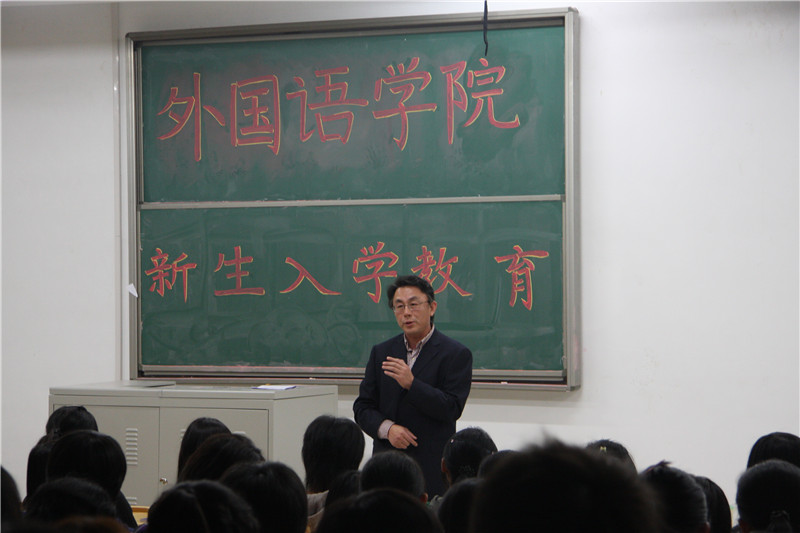 会上,李毅院长首先就外国语学院的学科专业情况,师资队伍,学院发展历程做了简介;并围绕“大学是什么”、“大学生如何规划自己的大学生活”“外语专业人才培养与发展趋势”三个方面展开。他要求同学们必须树立远大的理想与人生目标,勤奋学习、善于思考、全面发展。当代大学生应该具有历史责任感和时代使命感,注意人文精神的培养和人文素质的提高,以适应未来社会发展的要求。其次,介绍了国内外语专业的发展现状,回应了社会上对外语专业学科地位属性的质疑,要求同学们热爱自己的专业,正确理解外语专业的培养目标,转变思维方式和学习习惯。他还要求同学们要注意培养自己的创新精神、创新素质和创新能力。