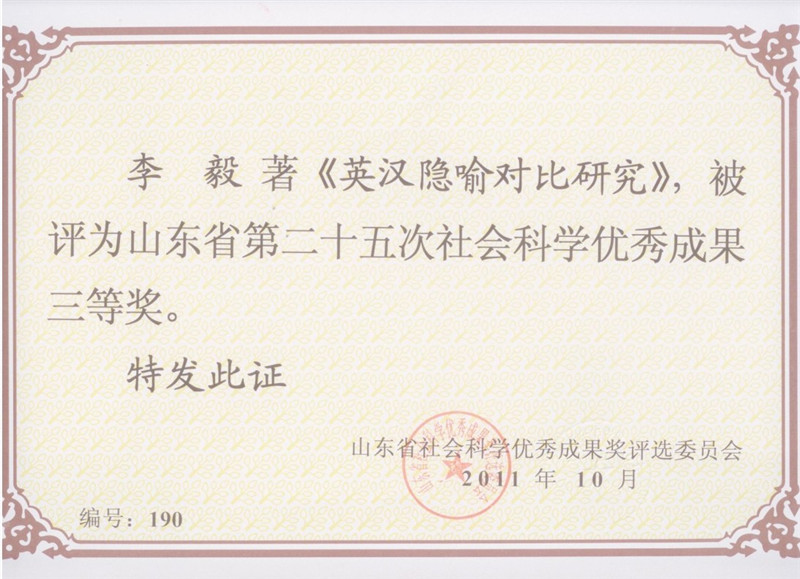 近日,山东省社会科学优秀成果奖评委会办公室公布了山东省第25次社会科学优秀成果奖评选结果,我院李毅教授的专著《英汉隐喻对比研究》荣获省社会科学优秀成果著作三等奖。本次山东省社会科学优秀成果评奖按经济学、管理学、哲学社会学、政治学、法学、文学语言学、文化学、教育学、历史学、普及与应用成果10个学科类别、每个学科类别中分著作与文章两类进行分类评选,最终评选出重大成果奖3项、一等奖20项、二等奖91项、三等奖156项,共计270项;其中,文学语言学学科共评选出重大成果奖2项(著作类2项)、一等奖2项(文章类2项)、二等奖15项(著作类5项,文章类10项)、三等奖24项(著作类8项,文章类16项),共计43项。