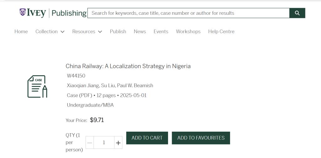 外国语学院青年教师江筱倩博士作为第一作者与工商管理学院刘素教授、加拿大西安大略大学毅伟商学院教授Paul W. Beamish合作撰写的《China Railway: A Localization Strategy in Nigeria》在国际知名的商业案例库Ivey Publishing发表,案例编号:W44150,该成果属我校A1类成果。