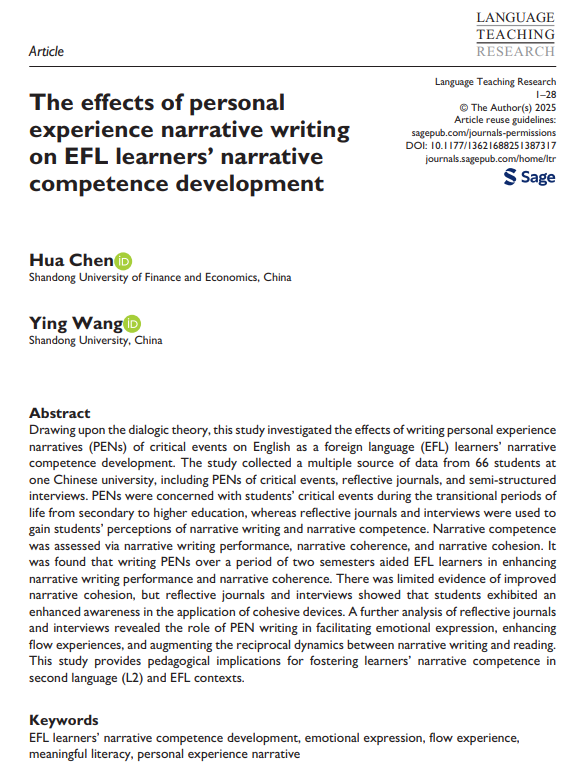 近日,外国语学院陈华教授在语言学领域知名国际期刊Language Teaching Research发表题为“The effects of personal experience narrative writing on EFL learners’ narrative competence development”的学术论文。陈华教授为第一作者,山东大学王颖教授为通讯作者。Language Teaching Research系SSCI一区期刊、中科院一区TOP期刊;JIF排名:21/306,2024年影响因子:3.8,近五年影响因子:5.3,属于我校A1类期刊。