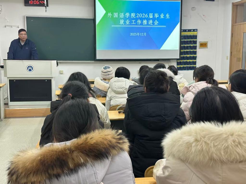 12月26日,外国语学院在舜耕校区分别召开本科生、研究生就业工作推进会。学院党委副书记张国栋、毕业生辅导员陈夏、张念礼及全体本科、研究生毕业班同学参加会议。