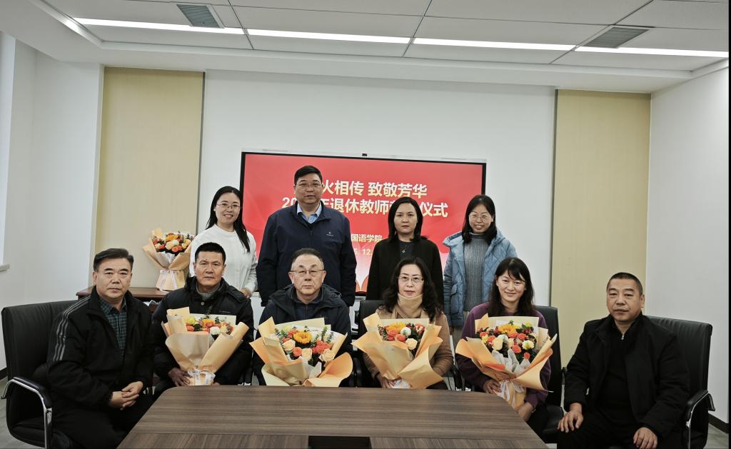 为弘扬尊师重教优良传统,致敬为学院发展奉献毕生心血的荣休教师,2025年12月31日,外国语学院隆重举办2025年退休教师荣休仪式。荣休教师李毅、王璐、张震、姚雁青应邀出席。学院党委书记姜竹青、院长于秀金、党委副书记张国栋、王恩娟,副院长杨静、阮岳湘参加。仪式由于秀金主持。