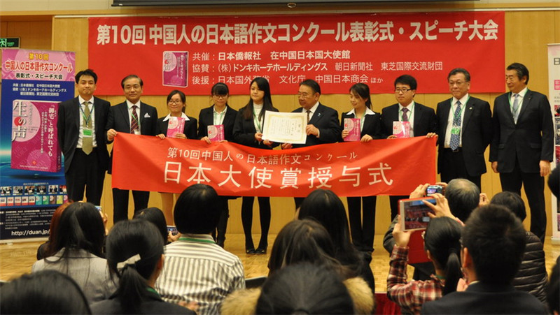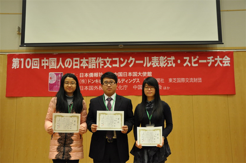 12月12日,由日本侨报社和日中交流研究所共同主办的第十届全国日语作文大赛颁奖仪式在日本大使馆隆重举行。本次大赛共有来自全国196所院校的4133人参赛,参赛人数创历史新高,竞争空前激烈,我院学生的获奖人数在全国各参赛高校中名列榜首。日语专业2012级的陈谦同学获得一等奖,日本驻华大使木寺昌人亲自向其颁发了奖状和奖品。2012级的姚怡然、2011级的申皓获得三等奖。获奖同学在日语专业副主任冯晶副教授和外教新村美有纪的带领下,参加了颁奖仪式。颁奖嘉宾有日本驻华大使木寺昌人,北京日本学研究中心主任、中国日语教学研究会会长徐一平以及来自东芝株式会社、中国日本商会等知名企业界的代表。日本朝日新闻、NHK等各大媒体全程报道。