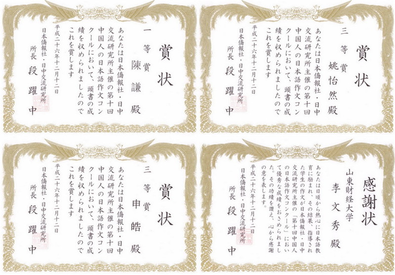 作为我校首届外语技能系列大赛的一个环节,外国语学院日语专业于今年5月组织了日语写作大赛,赛后安排教师对优秀学生进行了精心指导,并推荐参加了国内日语界规模、影响最大的赛事之一--“第十届全国日语作文大赛”。本次大赛以“ACG(动画、漫画、游戏)和我”、“公共礼仪与中国人”为主题,历时5个月,经过4轮严格的评审,最终评选出特等奖1名,一等奖5名,二等奖15名,三等奖40名。另外,陈谦和姚怡然同学的指导教师新村和申皓同学的指导教师李文秀获得了主办方颁发的“感谢状”,新村还被委托为新一届作文大赛的“推广大使”。