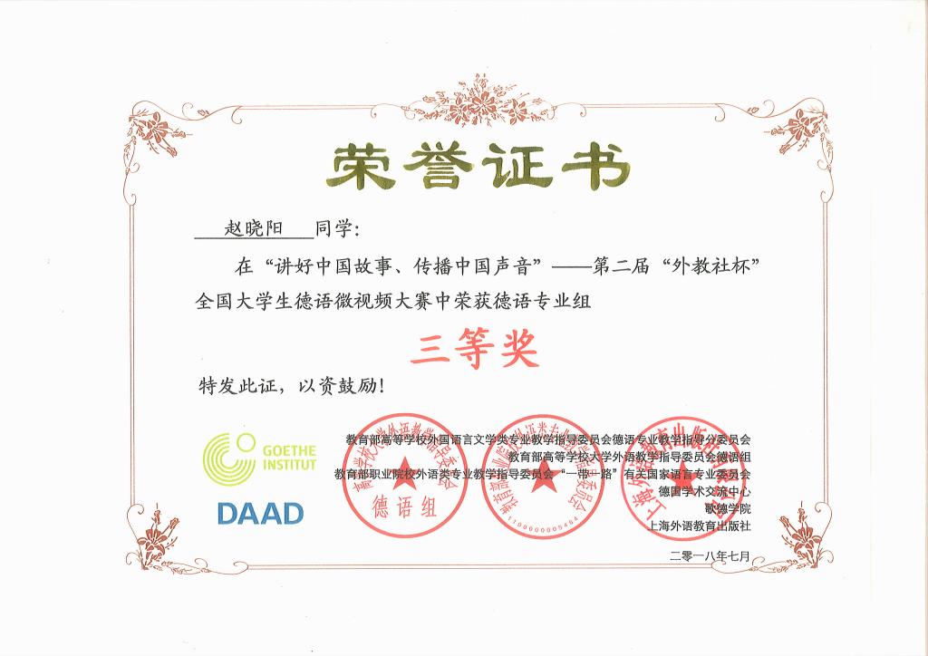近日,由教育部高等学校外国语言文学类专业教学指导委员会德语专业教学指导分委员会、教育部高等学校大学外语教学指导委员会德语组、上海外语教育出版社、德意志学术交流中心以及歌德学院等联合举办第二届“外教社杯”全国大学生德语微视频大赛落下帷幕,我院德语系2016级赵晓阳同学的作品《我的青岛》在德语专业组脱颖而出获三等奖。